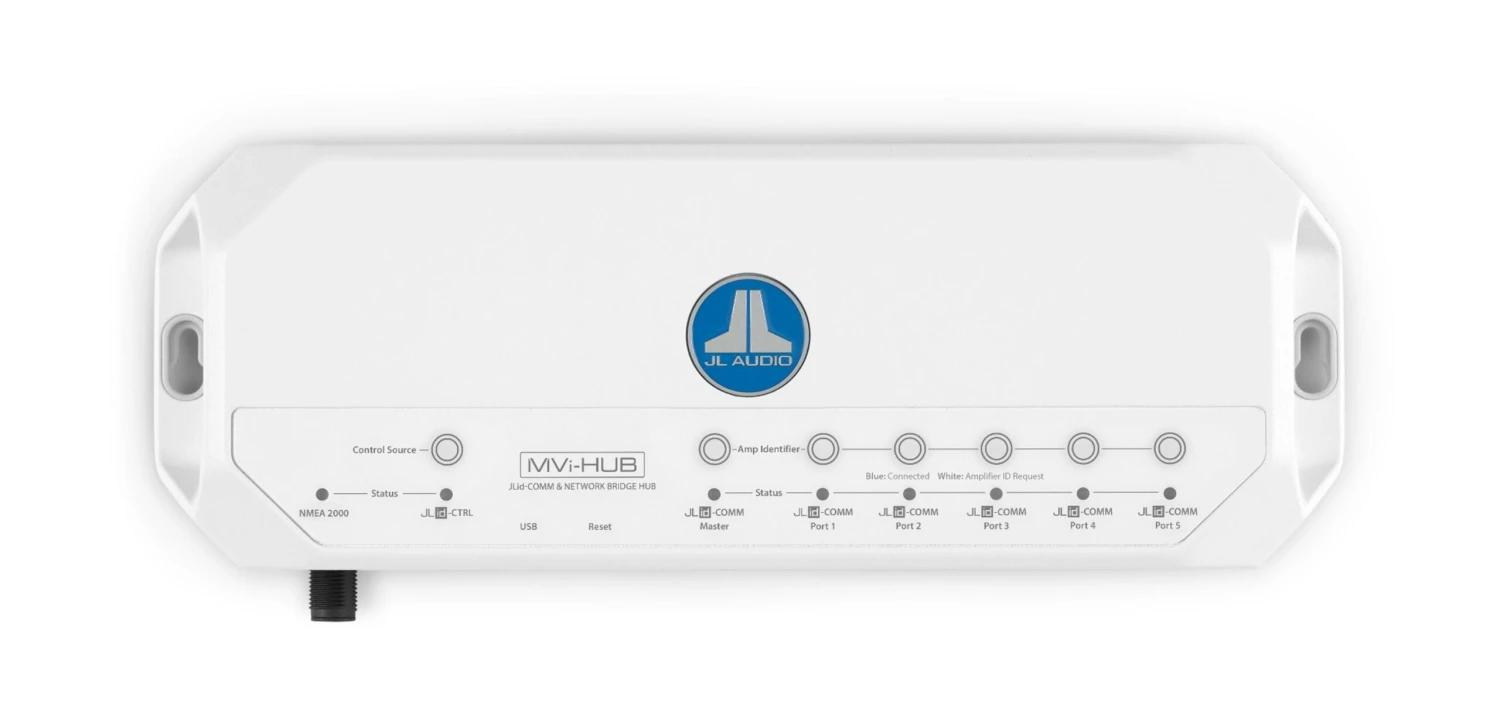 The MVi-HUB includes JLid-COMM ports to connect up to six amplifiers (one âMasterâ MVi amplifier and up to five âSlaveâ MV or MVi amplifiers) using standard CAT5e cables, allowing users to quickly switch between amplifiers during the tuning process, without disconnecting and connecting multiple cables.